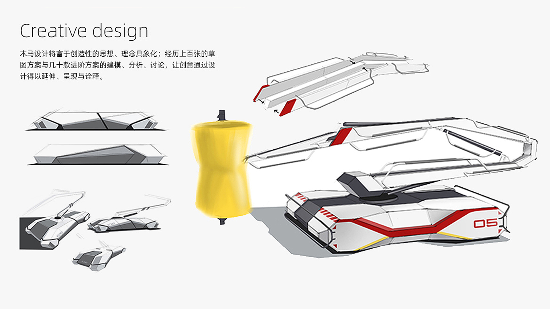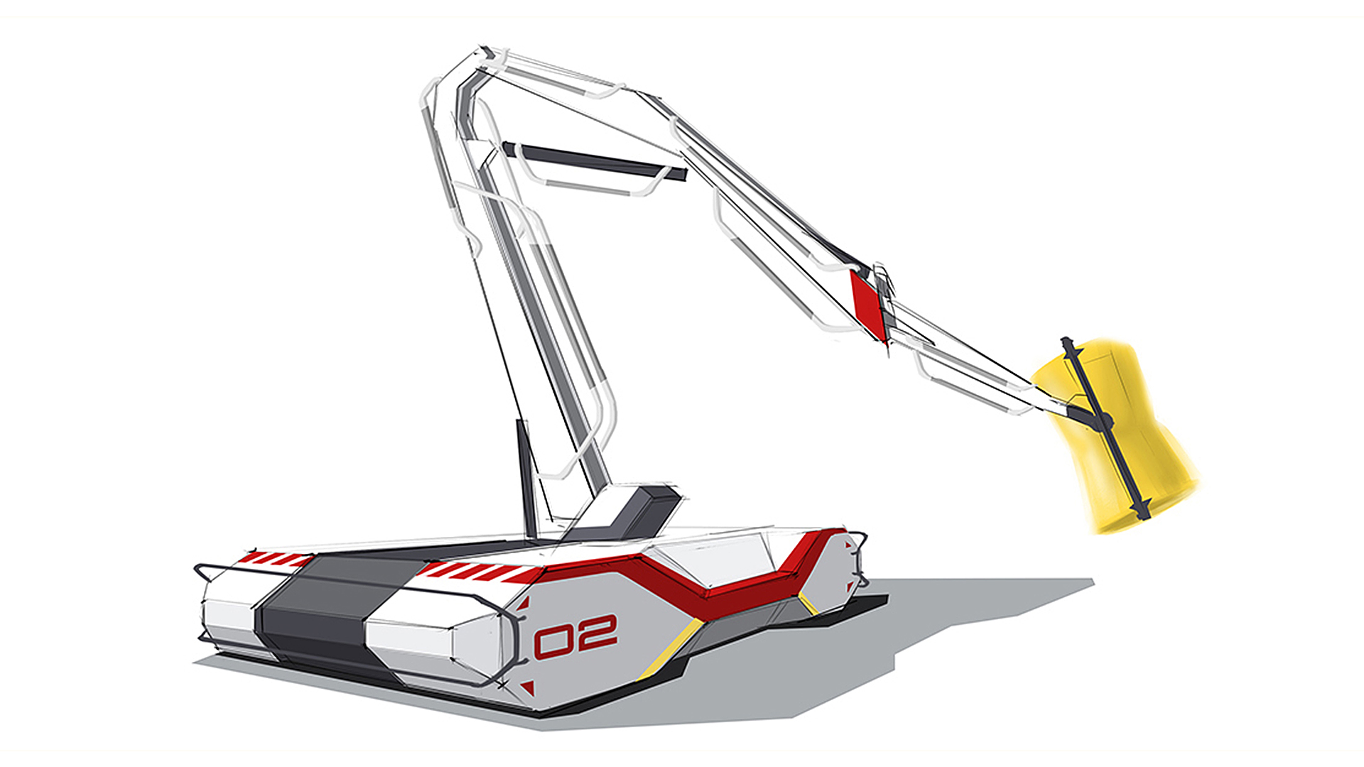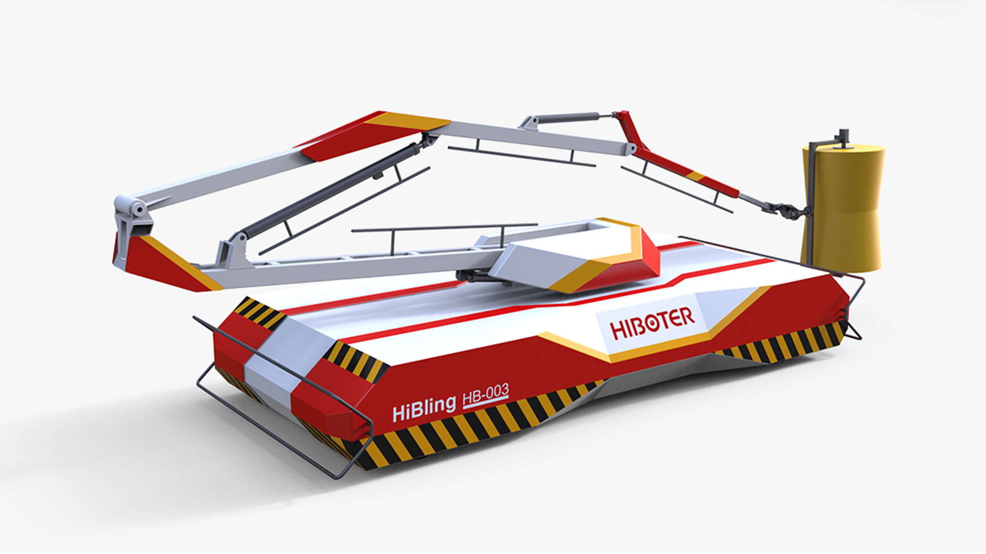 HiBling飞机清洗机器人造型具备科幻色彩,设计师在考虑钣金工艺实现性的前提下,通过大量斜面与斜线的运用营造出一种很强的视觉冲击力。将一些“隐形”战机的元素结合在其中,整体科技感十足。