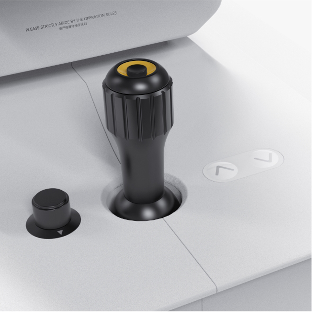 完整的大曲面包裹住主机的所有结构件,深灰与白色的分色,整机充满未来与科技感,赋予产品引领行业的使命;嵌入式脸托,隐藏式抠手等细节的设计,尽量保证产品 设计元素的统一性,增强一体性。 手柄处黄色标识圈作为品牌识别点将应用到系列产品中,形成视微品牌自己的品牌形象特点。