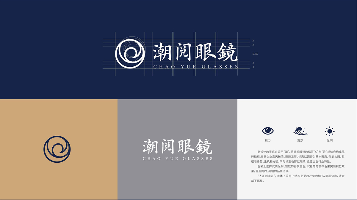 此设计的灵感来源于“潮”。将潮阅眼镜的缩写“C”与“潮“相结合构成品牌徽标,寓意企业乘风破浪,迅速发展。标志以日出作为基本形态,代表太阳,象征看希望、生机和光明,同时标志也形似眼睛,象征企业行业特性。