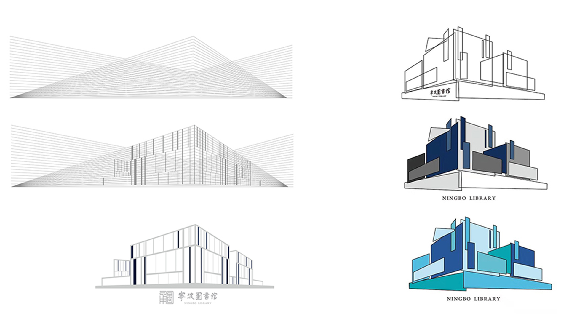 形式二:①利用建筑立面的纵横透视线条,部分点缀深蓝色的粗线条,塑造出图书馆严谨冷静的一面,始终以一个坚定严肃的形象为广大市民提供借阅服务。