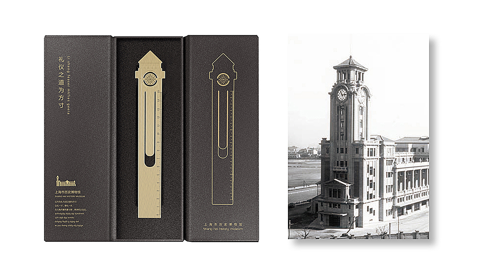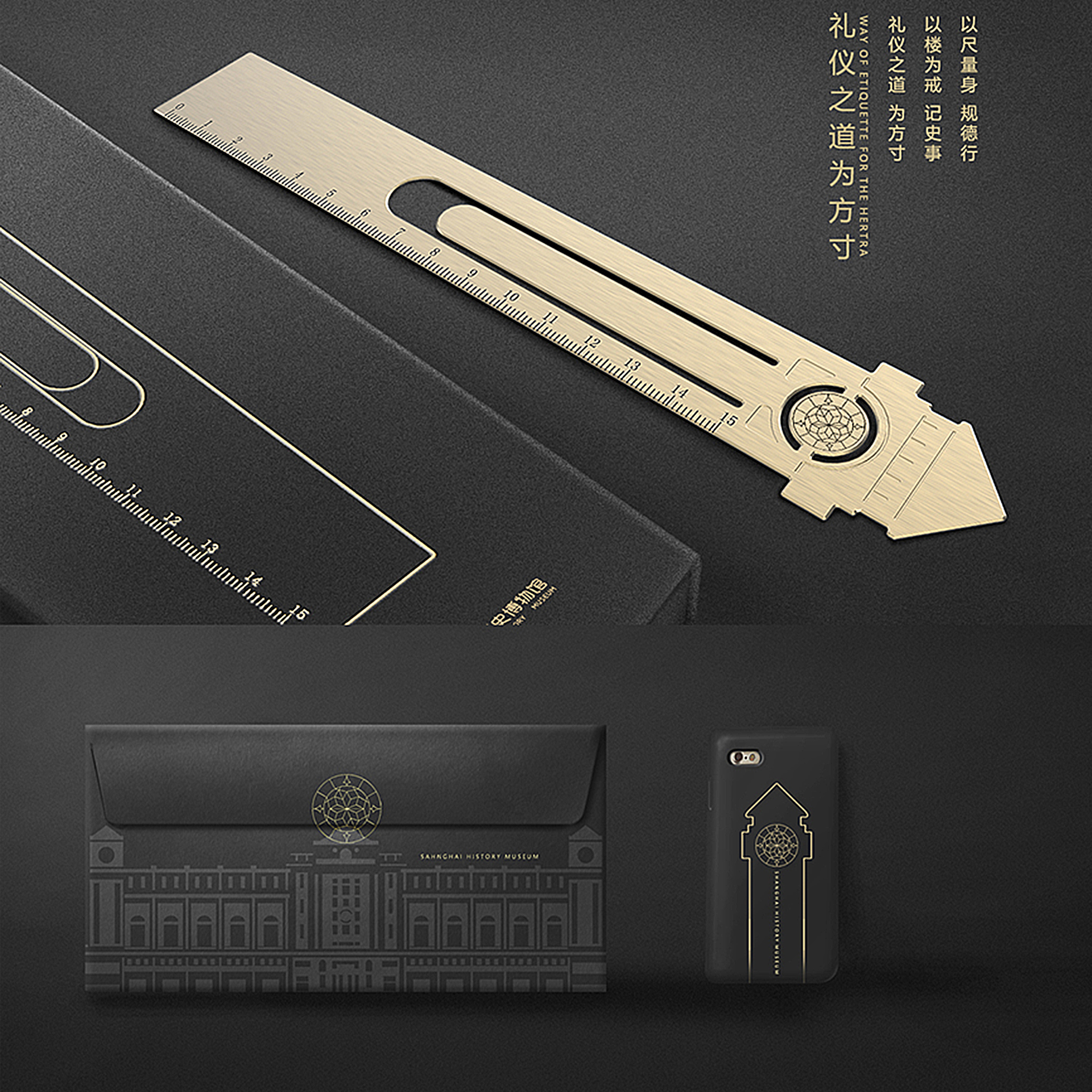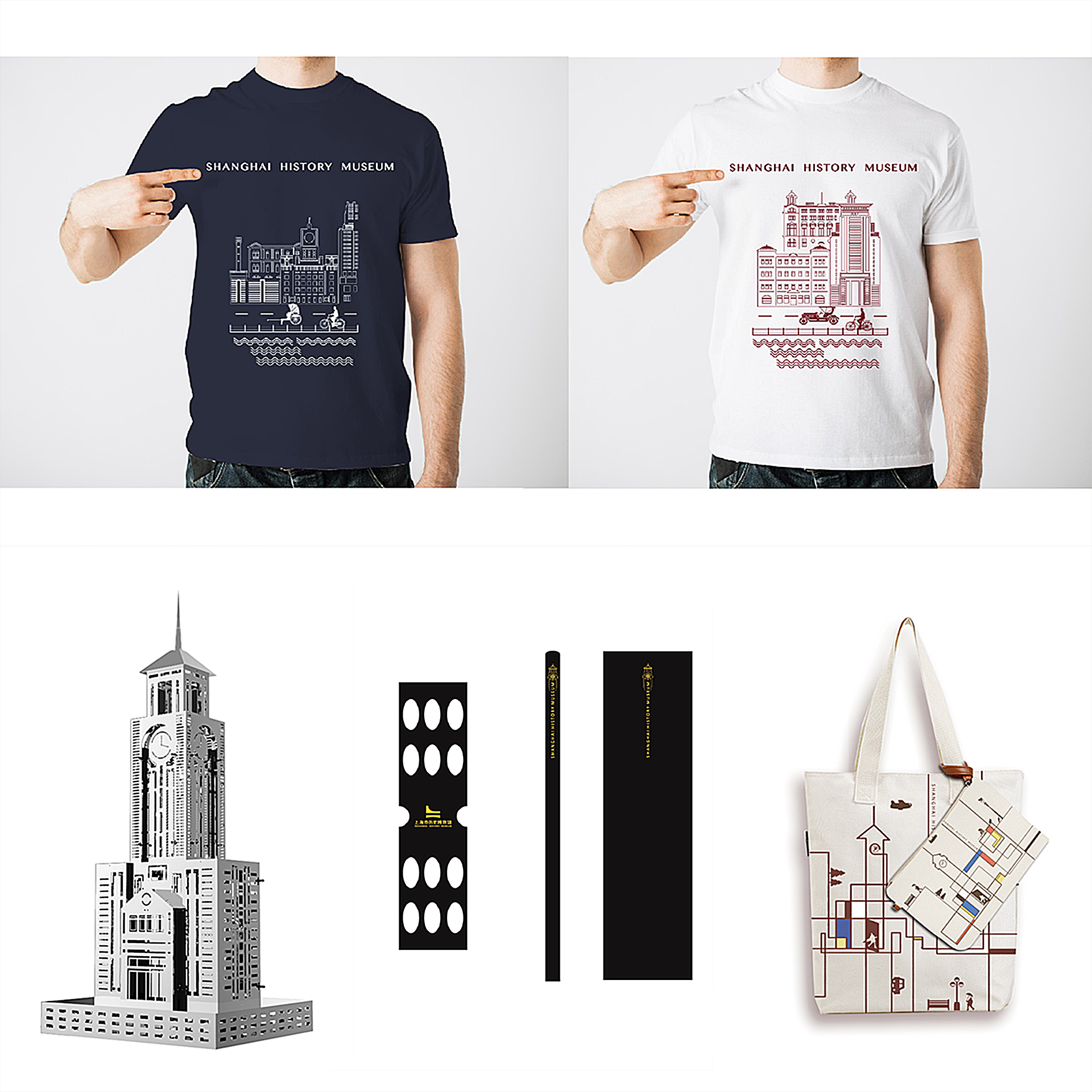 其二:设计师以整栋建筑为设计源,将繁琐的建筑外形与图纸简化,以几何化、扁平化、符号化手段来突出建筑外观。辅以活泼配色,用色彩的对比凸显上海历史博物馆“古今对话,适应当代”的气质,同时也对外展示上海历史博物馆包罗万象的大气胸怀。形成一套寓教于乐,受儿童喜欢的系列产品。辅以黑色与金色,用强烈的色彩对比凸显上海历史博物馆“满腹经华,低调谦逊”的气质,同时也对外展示上海历史博物馆包罗万象的大气胸怀。形成一套现代高端的系列产品。
