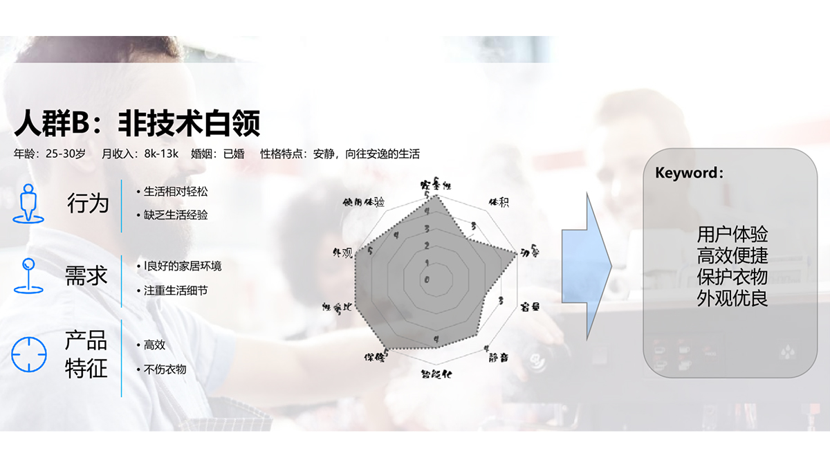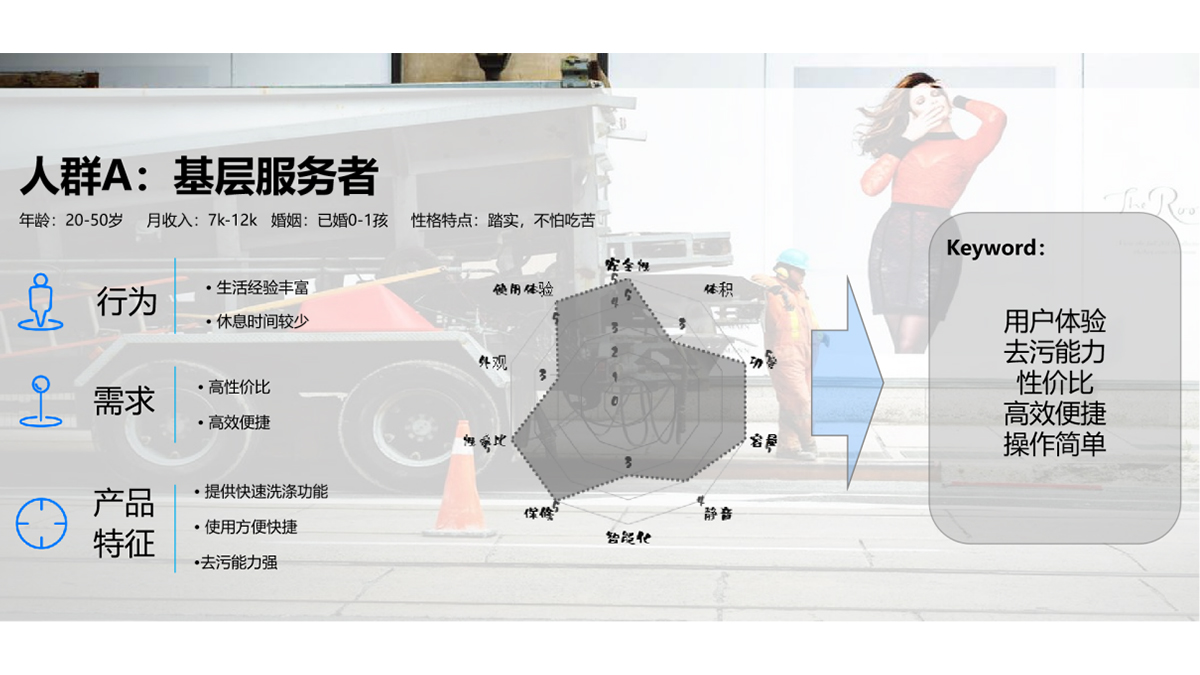 滚筒洗衣机的普及很大程度扩大了用户群体,这要求团队需要从多个维度对人群进行划分和了解。从角色数据的角度,不同的职业决定了收入层次及消费能力,从而影响滚筒洗衣机的定价。木马团队深入研究划分消费者族群,将其分为基层服务者、非技术白领及商业服务业三类,分别剖析了者三类人群对于洗衣机的不同需求,并制作用户画像,如下图。