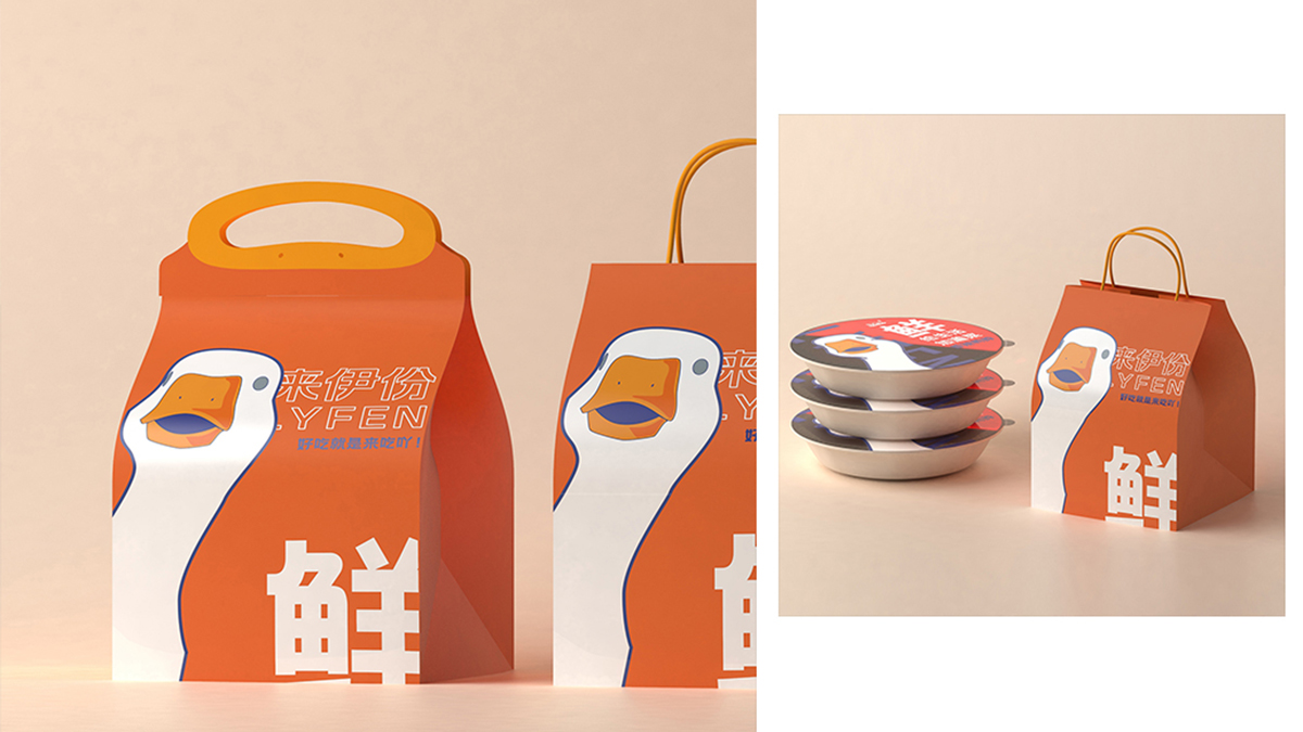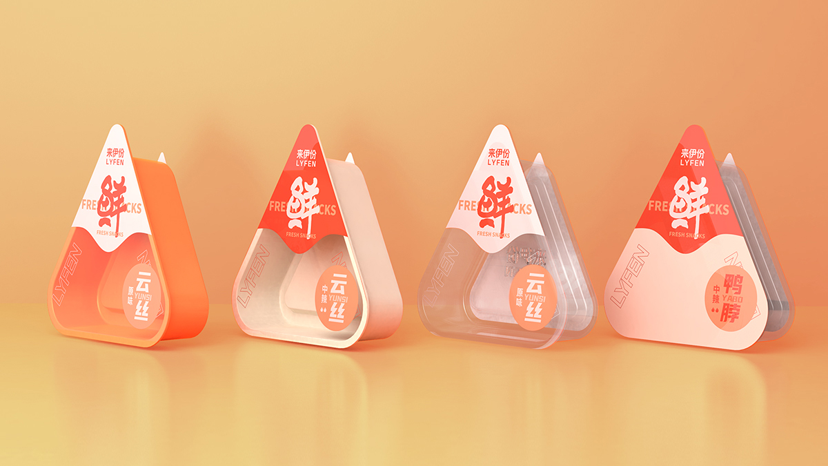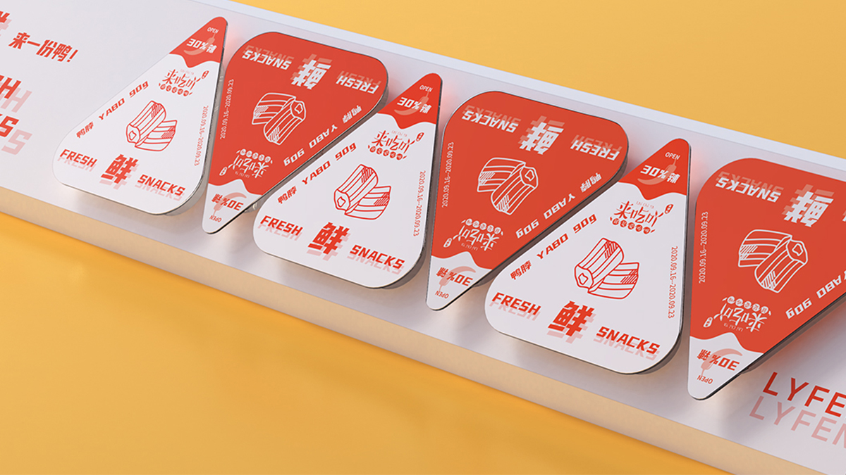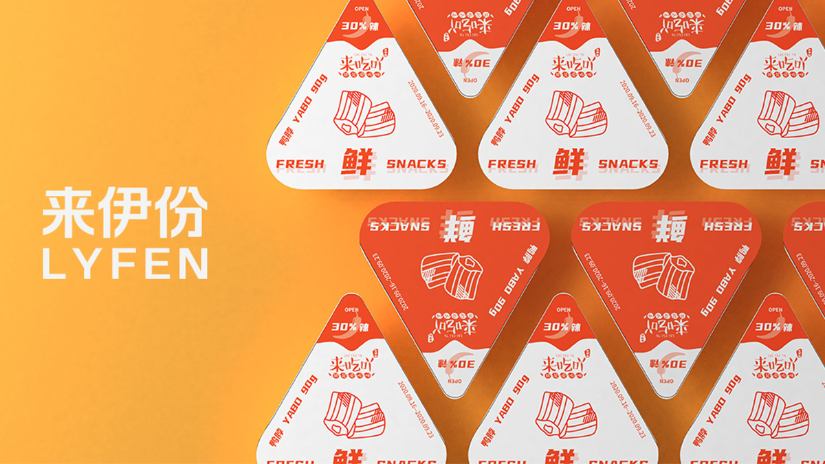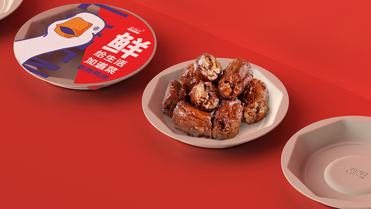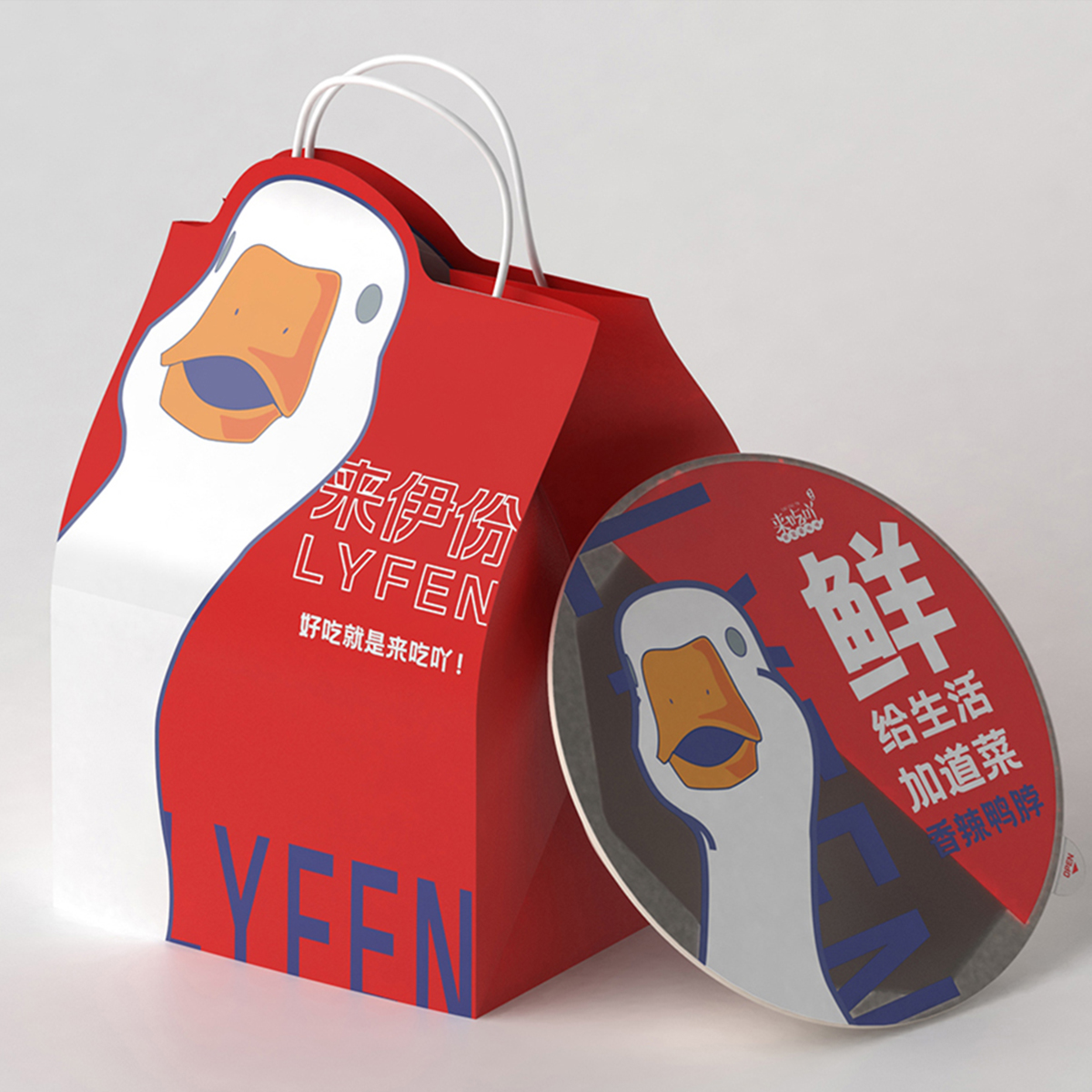 来伊份-给生活加道菜:八边食盒,为味觉锦上添花。采用了中国传统餐具锦盒的八边造型,八也象征着八方来客,兼容并蓄,雅俗共赏的包容态度,与来伊份的品牌文化相符。底部贴纸内附纸巾手套包,提升消费者食用体验。活力鲜食,运用高饱和的明艳色彩和可爱年轻的鸭子形象提升视觉吸引力。