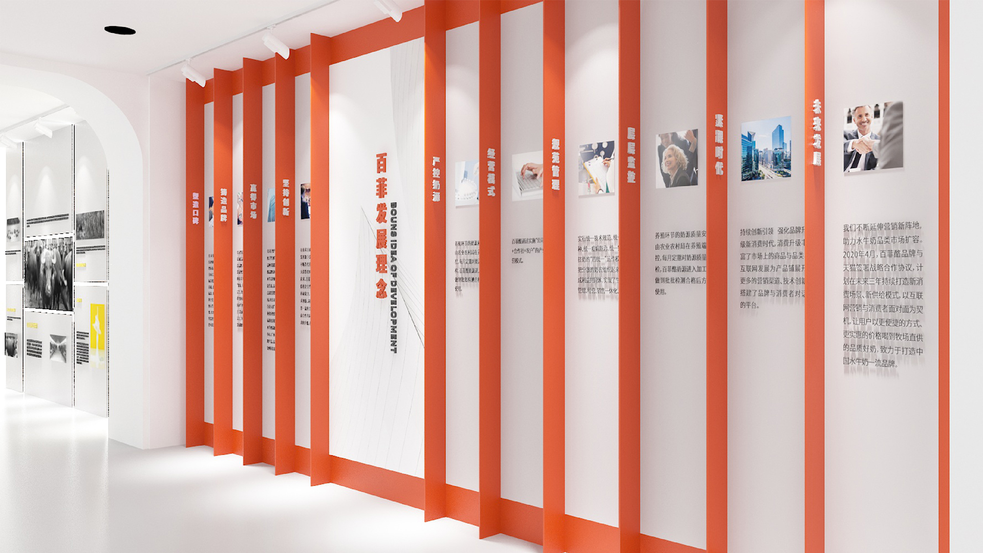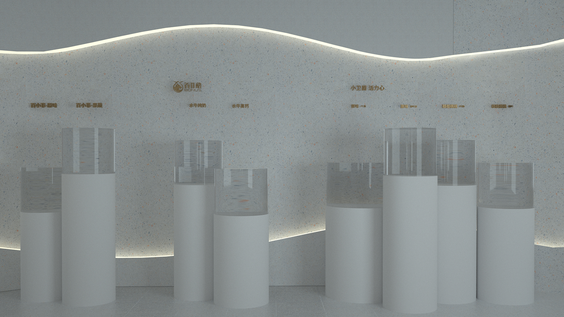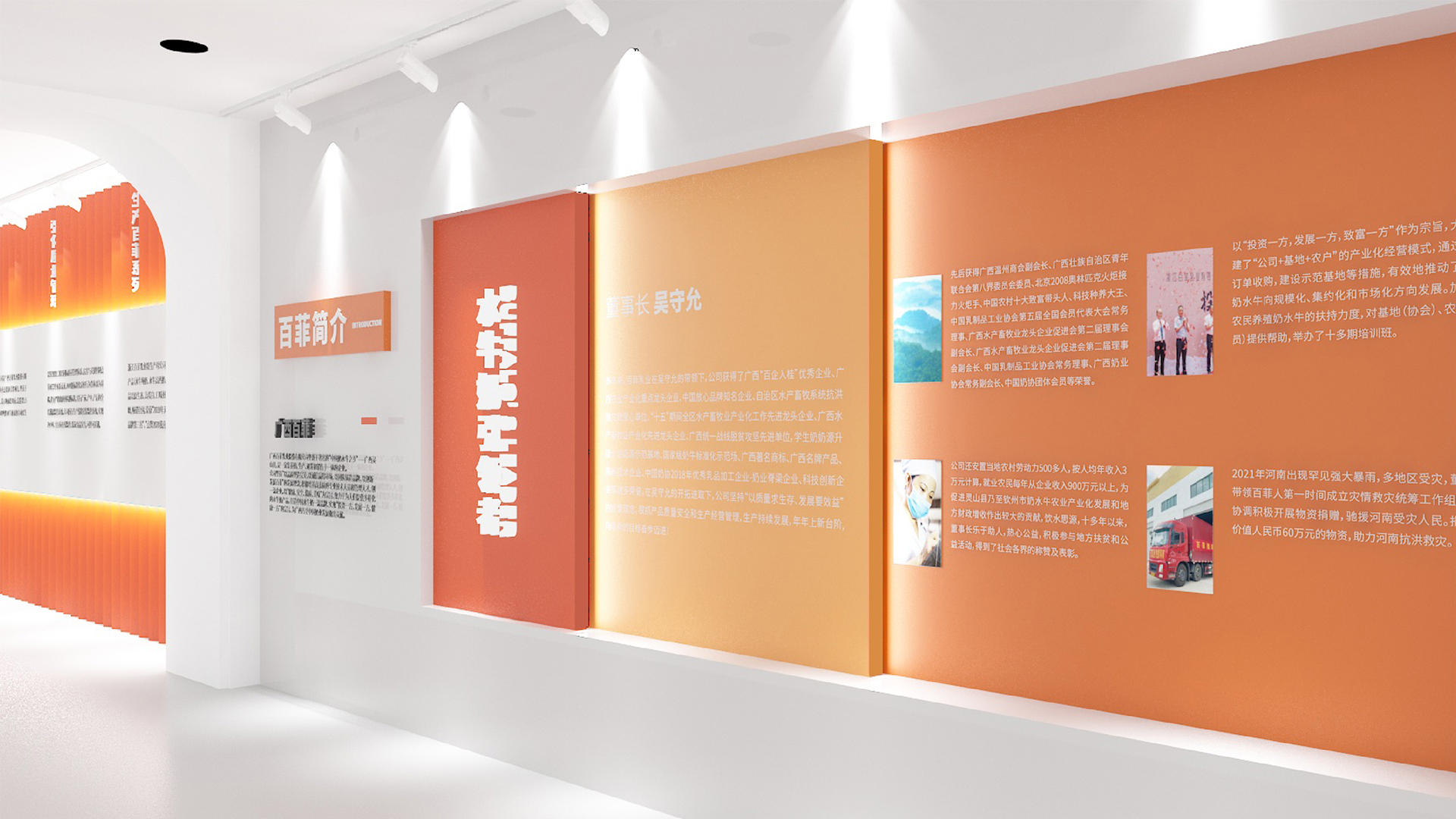 长廊文化墙以彩虹为创意,依次讲述百菲从0-1的品牌故事。色彩明亮让人眼前一亮,颜色的变化与丰富让人更有兴趣。彩虹寓意着美好。百菲一路保持初心,专注研发保证品质,最终好的产品被消费者认可,雨后彩虹好运会一直陪伴。
