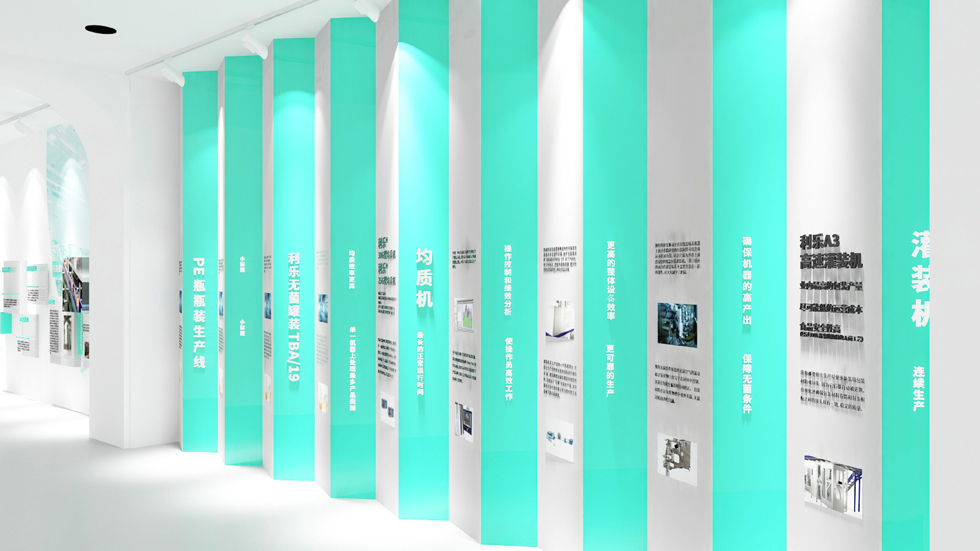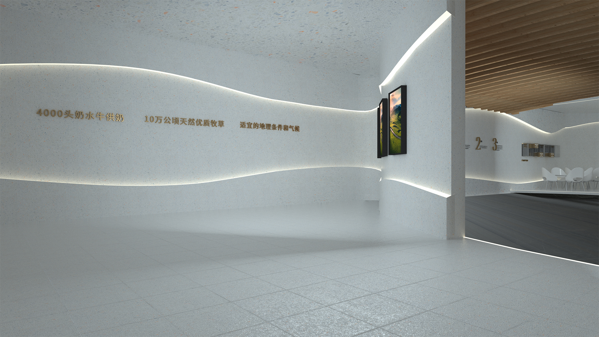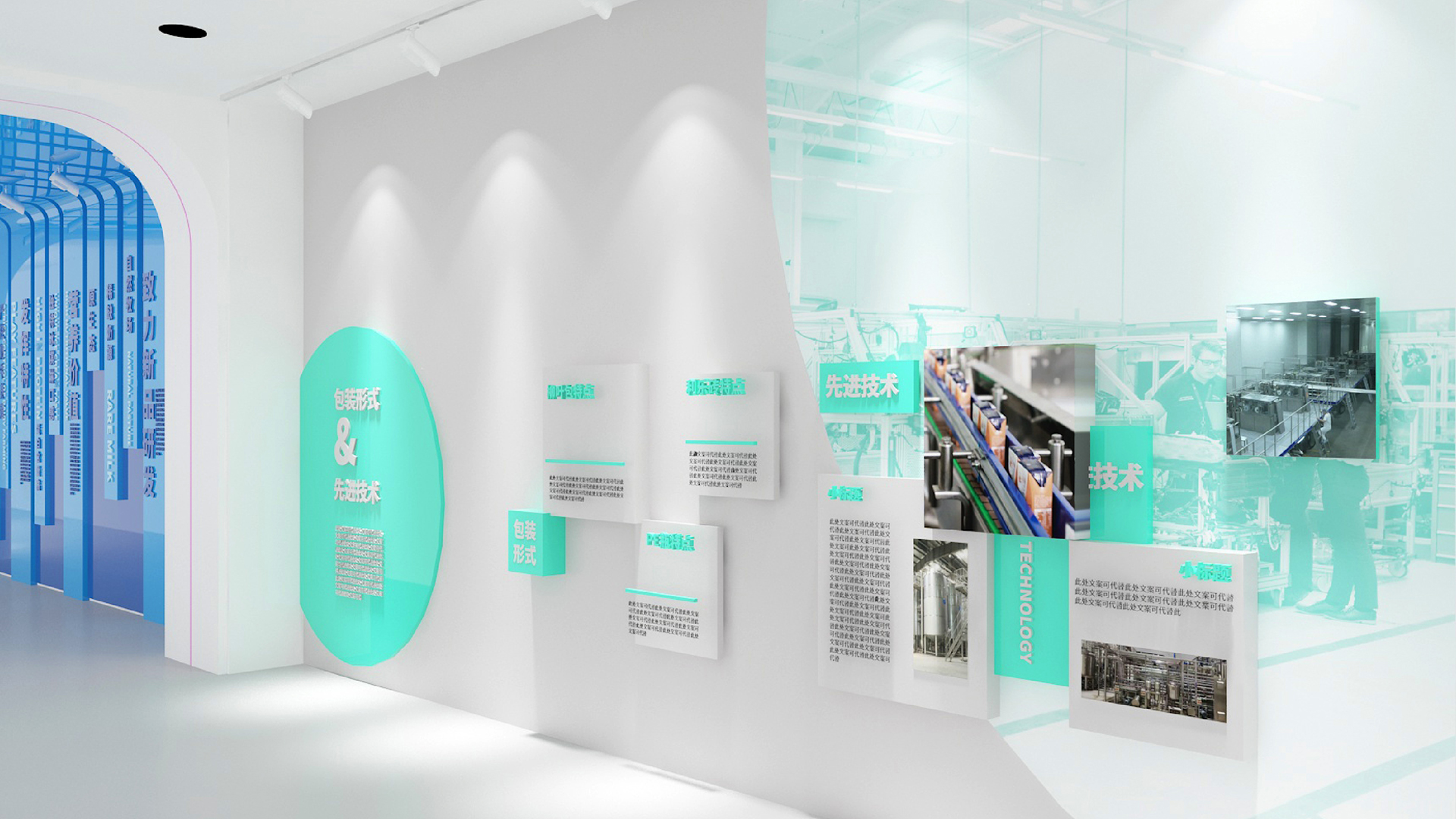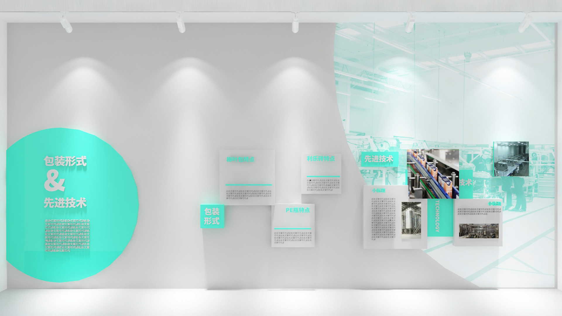 总控室后的玻璃,因为参观走廊颜色比较丰富,考虑到如果这里也做色彩或者比较复杂的设计,会造成是视觉混乱,所以我们把这扇玻璃上的遮挡装饰设计成和墙面一样的白色,放上slogan,这样整体比较统一自然。