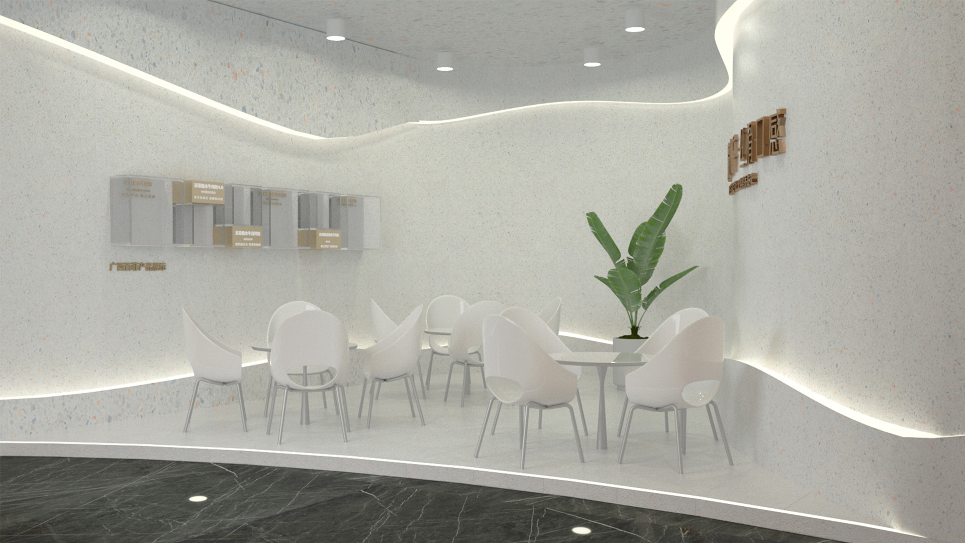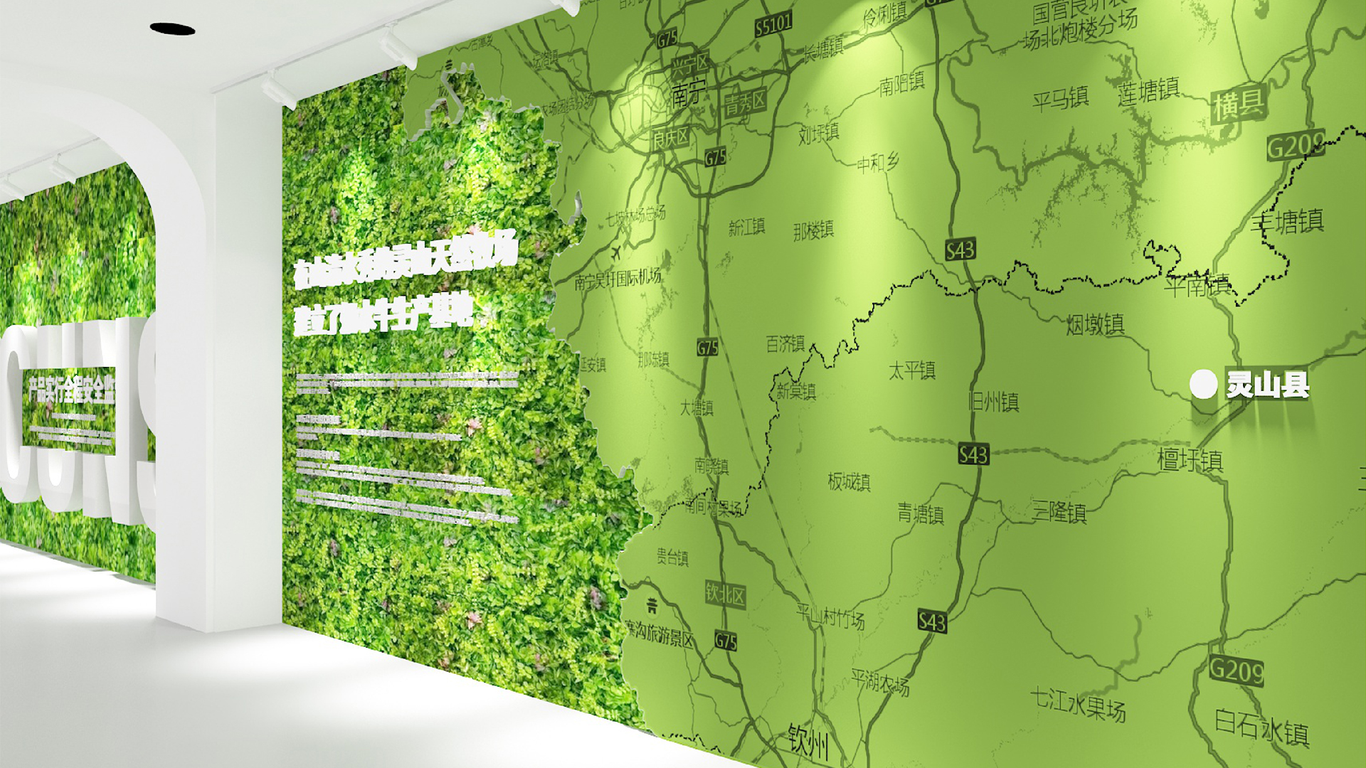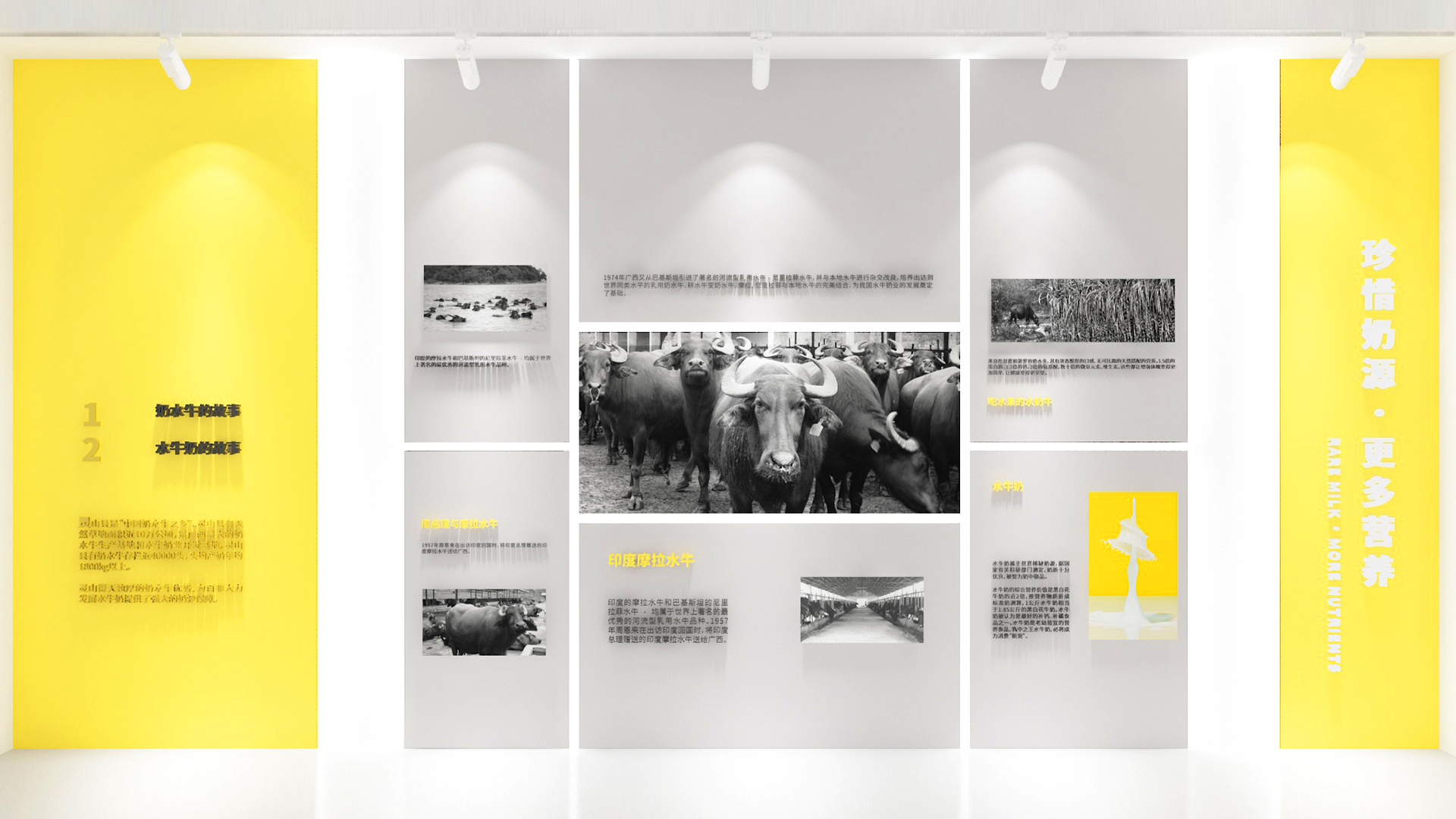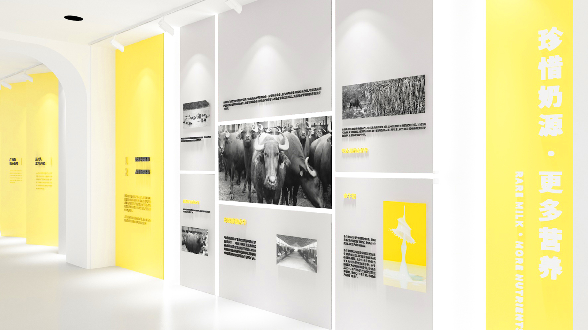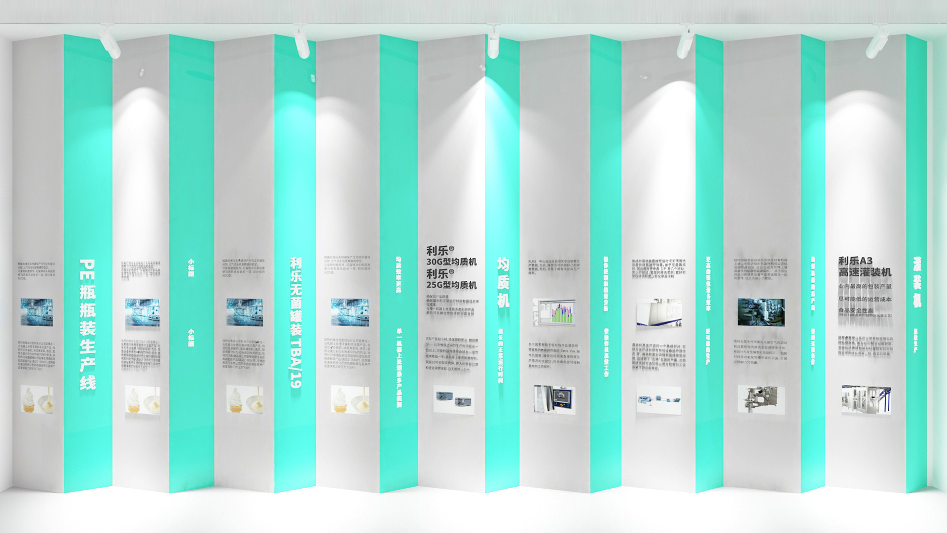 总控室后的玻璃,因为参观走廊颜色比较丰富,考虑到如果这里也做色彩或者比较复杂的设计,会造成是视觉混乱,所以我们把这扇玻璃上的遮挡装饰设计成和墙面一样的白色,放上slogan,这样整体比较统一自然。